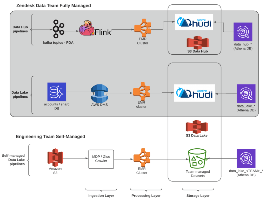 Các đường dẫn dữ liệu tự quản lý cho phép các đội kỹ sư sản phẩm sử dụng hồ chứa dữ liệu (data lake) cho những trường hợp sử dụng không phù hợp với các mẫu tích hợp tiêu chuẩn. Tất cả các đội kỹ sư sản phẩm trong nội bộ của Zendesk có thể sử dụng các công cụ cơ bản như Amazon EMR, Amazon S3, Athena, và AWS Glue để xuất bản bộ dữ liệu phân tích của riêng họ và chia sẻ với các đội khác.