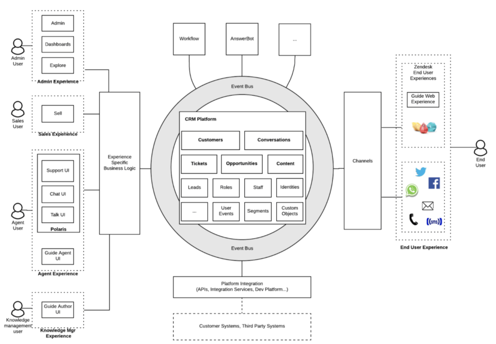 Zendesk là một nền tảng dịch vụ khách hàng, nơi kết nối hơn 100.000 thương hiệu với hàng trăm triệu khách hàng qua điện thoại, trò chuyện, email, nhắn tin, các kênh xã hội, cộng đồng, trang web đánh giá và trung tâm trợ giúp. Họ thu thập và sử dụng dữ liệu từ các kênh này để đưa ra các quyết định cho chiến lược kinh doanh tốt nhất và tạo ra các sản phẩm mới và cải tiến các sản phẩm khác.