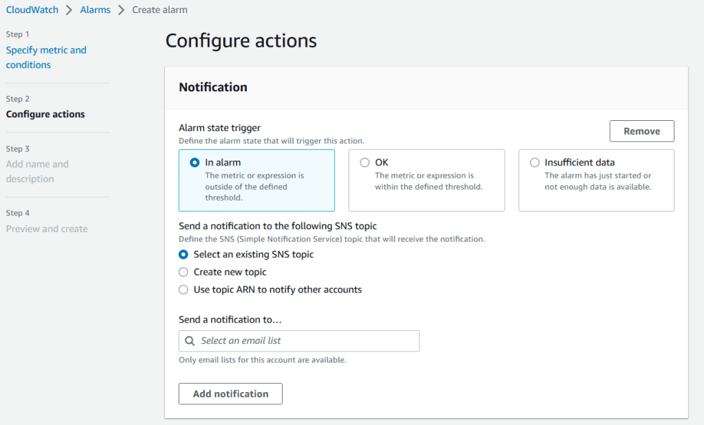 7. Trên trang Configure actions, bạn có thể thêm chủ đề SNS để thông báo và nhấn Next.
