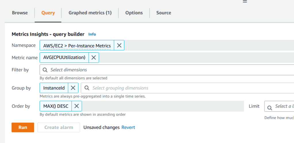 3. Đối với alarm thứ nhất, chỉ định Namespace là AWS/EC2 và chọn Per-Instance Metrics. Dưới Metric Name, chọn hàm AVG và chọn CPUUtilization, sau đó nhấn Run.
