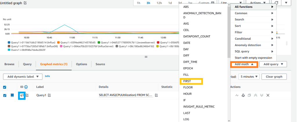 12. Hiện tại, báo động không được hỗ trợ với nhiều chuỗi thời gian, vì vậy bạn cần sử dụng các hàm toán học định lượng để có được một chuỗi thời gian duy nhất. Nhấp vào tab Graphed metrics. Trong Graphed metrics, nhấp vào Add math (được làm nổi bật bằng màu cam), All functions và chọn hàm FIRST (được làm nổi bật bằng màu vàng). Hàm này sẽ trả về chuỗi thời gian đầu tiên trong tất cả các dữ liệu chuỗi thời gian.