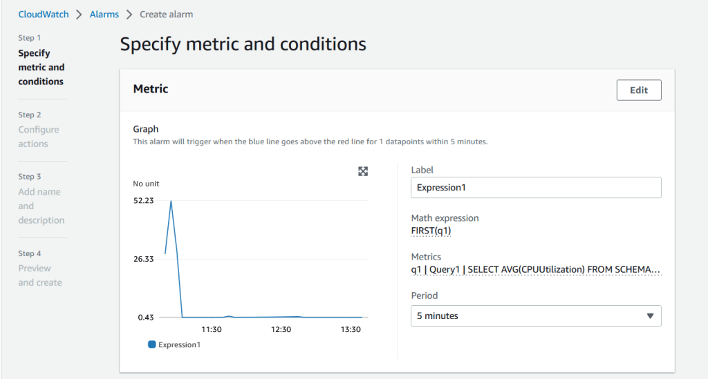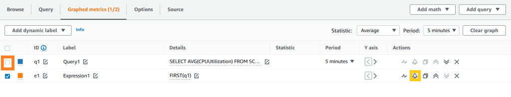 14. Bỏ chọn hộp kiểm cho truy vấn Metrics Insight và nhấp vào biểu tượng báo động bên cạnh hàm Metric math. Điều này sẽ đưa bạn đến trang Tạo cảnh báo, nơi bạn có thể làm theo cùng quy trình như trước để cấu hình ngưỡng báo động, chọn chủ đề SNS và sau đó tạo báo động.