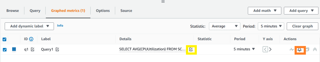 5. Trong Graphed metrics, bạn có thể xem toàn bộ truy vấn SQL bằng cách nhấp vào phần được đánh dấu màu vàng dưới phần chi tiết. Nhấn vào biểu tượng báo động (được đánh dấu màu cam) dưới Actions để tạo alarm.
