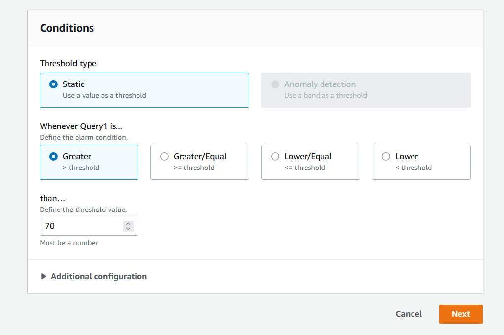 Chúng tôi sẽ thực hiện 2 cảnh báo sử dụng truy vấn Metrics Insights. Cảnh báo đầu tiên sẽ kích hoạt khi tỉ lệ sử dụng CPU trung bình trên tất cả các EC2 instance vượt quá 70%, và cảnh báo thứ hai sẽ kích hoạt khi Tỉ lệ sử dụng CPU của bất kỳ instance nào vượt quá 80%