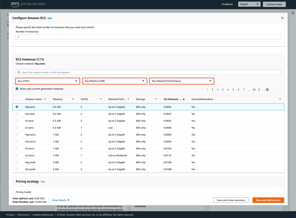 Nơi cuối cùng mà chúng ta có thể tìm kiếm tiết kiệm chi phí là bằng cách phân tích bất kỳ Workload dựa trên Amazon EC2 Linux và các loại instance cụ thể được sử dụng. Bằng cách tận dụng AWS Pricing Calculator, bạn có thể nhập yêu cầu tính toán hiện tại của mình (Bộ nhớ, vCPU, Mạng, v.v.) để xác định các instance dựa trên hiệu suất giá tốt hơn.
