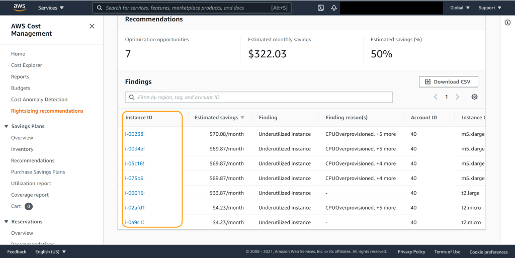 Hình 2. Xem đề xuất Điều chỉnh kích thước trong AWS Cost Explorer