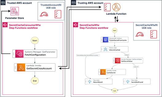- Một tài khoản AWS tin tưởng (ID tài khoản là 222222222222) với một luồng công việc Step Functions có tên SecretCacheWfw và hai role IAM có tên là TrustingAccountRl và SecretCacheWfwRl.