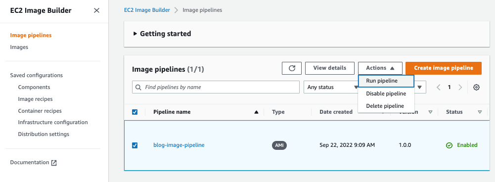 Trong console của Image Builder, dưới mục Image pipelines, chọn checkbox bên cạnh Pipeline đã tạo, chọn Actions và chọn Run pipeline.