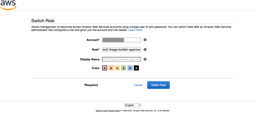 - Trong khi đăng nhập với IAM Principal có quyền truy cập để giả định IAM Role phê duyệt, làm theo hướng dẫn tại tài liệu AWS IAM để chuyển đổi một role bằng cách sử dụng bảng điều khiển để giả định role phê duyệt.