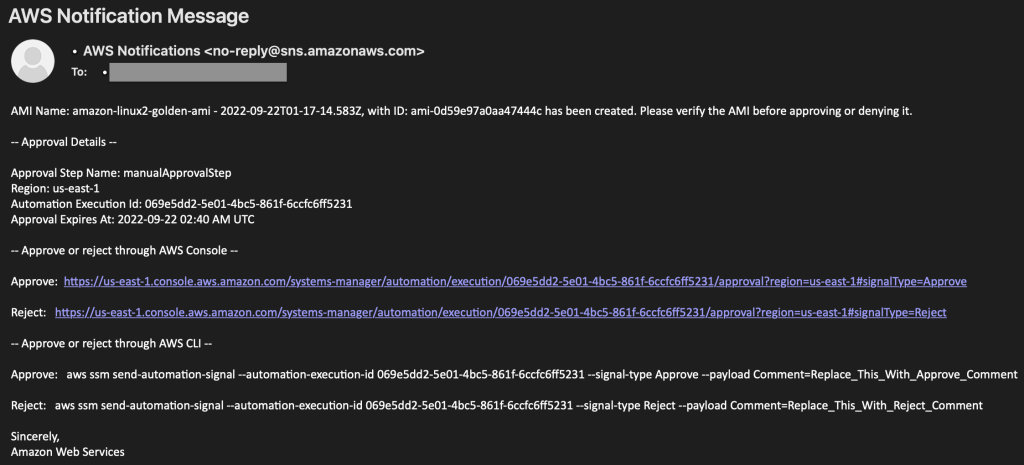 - Sau khi phê duyệt bước, một chức năng AWS Lambda sẽ chia sẻ AMI đến Tài khoản B và cũng gửi một email đến các người nhận email tài khoản đích thông báo rằng AMI đã được chia sẻ.