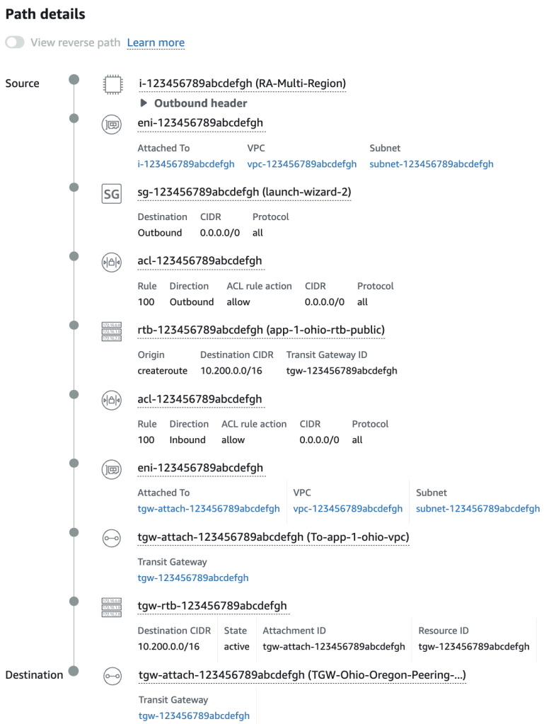 Chúng ta sẽ bắt đầu bằng cách xem xét kết quả của phân tích 1a như được biểu đồ hóa trong hình vẽ sau đây (Xem hình 3). Bạn cũng có thể kiểm tra chi tiết của con đường như được thể hiện trong biểu đồ sau. Lưu ý rằng các địa chỉ IP nguồn và đích đều xuất phát từ các tùy chọn dòng lệnh được cung cấp cho tập lệnh. Tài nguyên nguồn là “source-instance,” và điểm đến là “Transit Gateway peering attachment.”