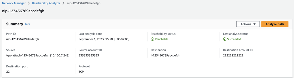 Tương tự, chúng ta cũng có một đường dẫn VPC Reachability Analyzer khác ở Region-2, và URL được cung cấp trong đầu ra JSON của tập lệnh. Hình sau đây hiển thị ảnh chụp màn hình của đường dẫn 1b. Lưu ý rằng đường dẫn này có thể tiếp cận được.