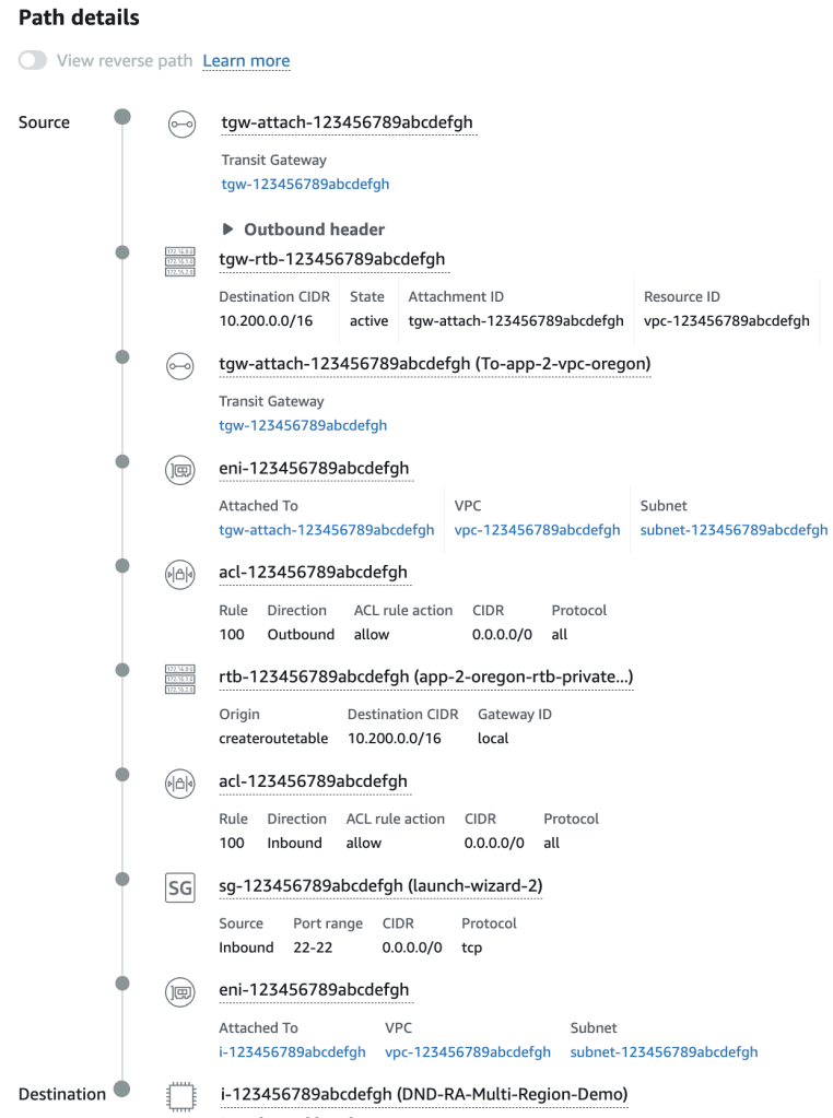Chi tiết đường dẫn cho thấy nguồn tài nguyên là Transit Gateway attachment, và tài nguyên đích là Amazon Elastic Compute Cloud (Amazon EC2) instance đích, như được hiển thị trong hình bên dưới.