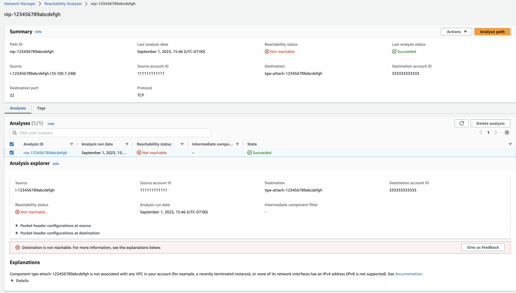Để khắc phục sự cố về đường dẫn thêm nữa, bạn có thể xem chi tiết của các phân tích từ Bảng điều khiển VPC Reachability Analyzer hoặc thông qua cuộc gọi API. Bây giờ hãy xem cách bạn sẽ sử dụng giải pháp này.