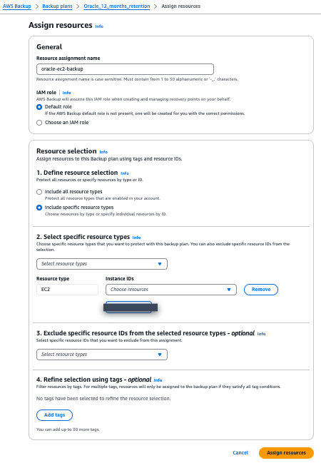 Bạn có thể chọn AWS Backup để lập lịch sao lưu hàng ngày của phiên bản EC2 (điều này chỉ sao lưu các volume EBS được gắn cục bộ). AWS Backup lưu trữ hiệu quả các bản sao lưu định kỳ của bạn bằng cách sử dụng các kế hoạch sao lưu. Chỉ có snapshot EBS đầu tiên thực hiện sao chép đầy đủ, và tất cả các snapshot tiếp theo là snapshot tăng dần, chỉ sao chép các khối đã thay đổi từ Amazon EBS, do đó giảm thời gian sao lưu và chi phí lưu trữ. Oracle hỗ trợ Tối ưu hóa Snapshot Lưu trữ, cho phép chụp snapshot của bên thứ ba của cơ sở dữ liệu mà không cần đặt cơ sở dữ liệu vào chế độ sao lưu. Theo mặc định, AWS Backup hiện tạo các bản sao lưu nhất quán về sự cố của các volume EBS được gắn với một phiên bản EC2. Người dùng không còn cần dừng phiên bản của họ hoặc phối hợp giữa nhiều volume EBS được gắn với cùng một phiên bản EC2 để đảm bảo tính nhất quán về sự cố của trạng thái ứng dụng của họ.