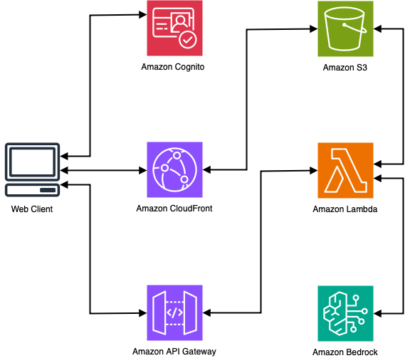 Hình 1: Sơ đồ kiến trúc của giải pháp được mô tả trong blog này. Các thành phần chính là một bucket Amazon S3, Amazon CloudFront, Amazon Lambda và các tài nguyên Amazon Bedrock.