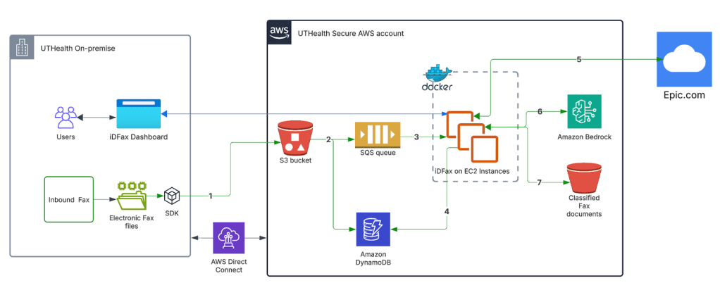 Các đội ngũ được hỗ trợ bởi Công nghệ thông tin UTHealth Houston và dịch vụ Web Amazon (AWS) đã xây dựng, triển khai và di chuyển một giải pháp mới có tên là iDFax. Giải pháp này, có thể xử lý dữ liệu sản xuất trên AWS, tận dụng sức mạnh của Generative AI để cách mạng hóa quy trình quản lý fax y tế. Nhóm đã sử dụng một mô hình cơ bản từ Amazon Bedrock, cung cấp một trải nghiệm dịch vụ được quản lý với độ chính xác cao, hiệu quả về chi phí trên AWS. Giải pháp được triển khai trong một môi trường landing zone an toàn, cung cấp các cơ chế kiểm soát bảo mật (security guardrails), cung cấp các rào chắn bảo mật và khả năng quan sát tập trung để đáp ứng các yêu cầu tuân thủ.