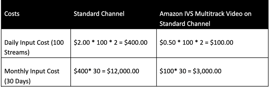 Ví dụ, hiện tại với Amazon IVS Multitrack Video, người xem được tận hưởng chất lượng tốt nhất cho kết nối của họ và khách hàng chỉ phải trả 0,50 USD một giờ, so với 2,00 USD mỗi giờ cho một kênh Standard không có tính năng Multitrack Video. Đối với một ứng dụng lưu trữ 100 luồng trực tiếp mỗi ngày, mỗi luồng kéo dài hai giờ, Amazon IVS Multitrack Video giảm 75 phần trăm chi phí đầu vào. Con số này tương đương với khoản tiết kiệm 9.000 USD mỗi tháng (xem Bảng 1), so với một kênh Standard thông thường, trong khi vẫn duy trì phát trực tuyến chất lượng cao.
