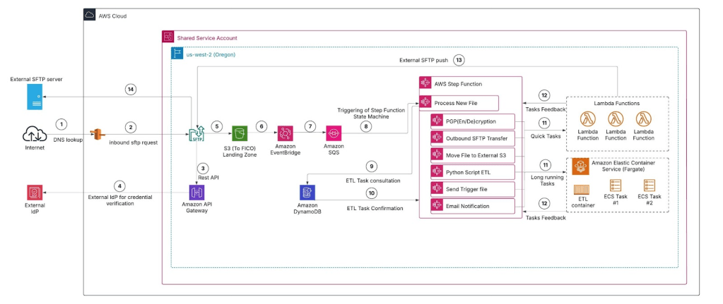 FICO đã phát triển một giải pháp MFT với Transfer Family để giải quyết các thách thức chính trong bảo mật truyền dữ liệu bên ngoài, quản trị dữ liệu, tự động hóa ETL và mở rộng tài nguyên. Kiến trúc sử dụng Transfer Family để quản lý các điểm cuối SFTP, đồng thời sử dụng Amazon S3 và Amazon Elastic Block Store (Amazon EBS) làm giải pháp lưu trữ hiệu quả. Giải pháp này điều phối logic kinh doanh và các quy trình ETL thông qua Step Functions, với Lambda xử lý các quy trình chạy ngắn và AWS Fargate quản lý các tác vụ chạy dài. Các kết nối Transfer Family cho phép thực hiện các thao tác file với bên ngoài một cách liền mạch, trong khi cơ sở hạ tầng được hỗ trợ bởi DynamoDB để cấu hình và ghi nhật ký, Amazon API Gateway cho các giao diện RESTful và CloudWatch để giám sát toàn diện. Bảo mật được duy trì thông qua AWS Secrets Manager để quản lý thông tin xác thực an toàn. Việc tích hợp các công nghệ không máy chủ này vào một kiến trúc hợp nhất cho phép FICO tạo ra một giải pháp MFT gốc đám mây an toàn, tiết kiệm chi phí, có tính khả dụng cao và có khả năng mở rộng, giải quyết hiệu quả các thách thức MFT truyền thống trong khi vẫn đáp ứng các nhu cầu hoạt động hiện đại.