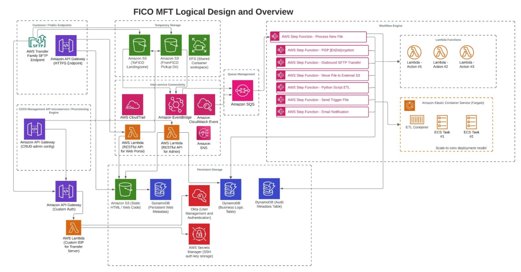 Việc FICO chuyển đổi cơ sở hạ tầng MFT cũ của họ thành một giải pháp hiện đại, gốc đám mây đại diện cho một thành tựu đáng kể trong quá trình hiện đại hóa truyền tệp doanh nghiệp. Sử dụng AWS Transfer Family làm **nền tảng cốt lõi**, kết hợp với các thành phần serverless bao gồm AWS Lambda, AWS Step Functions và AWS Fargate, cho phép FICO tạo thành công một giải pháp mạnh mẽ, có khả năng mở rộng để xử lý các quy trình truyền tệp phức tạp trên toàn bộ hoạt động toàn cầu.