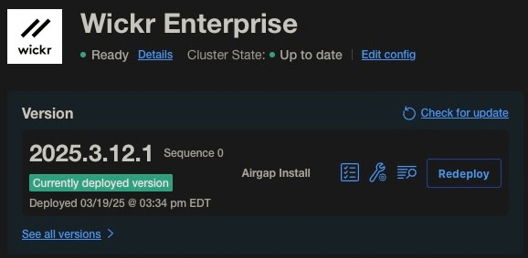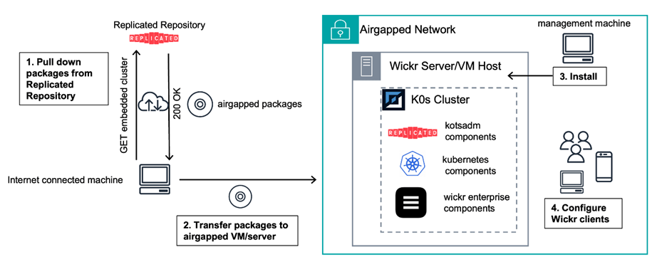 Phần mềm Wickr Enterprise được cài đặt bằng một công cụ gọi là Replicated KOTS. Một tính năng mới được phát hành có tên Embedded Cluster cung cấp khả năng cài đặt cả k0s Kubernetes cluster và phần mềm Wickr từ một binary duy nhất, không cần bất kỳ phụ thuộc internet nào. Khả năng này là một tùy chọn được tối ưu hóa cho các khách hàng hoạt động trong môi trường edge, cho họ khả năng triển khai giải pháp truyền thông mạnh mẽ một cách nhanh chóng mà không cần phải là chuyên gia Kubernetes.