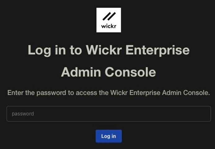 - Để đăng nhập vào bảng điều khiển quản trị, hãy nhập mật khẩu bạn đã thiết lập trước đó để đặt các tham số cho quá trình cài đặt Wickr Enterprise. Chọn Log in, như được hiển thị trong ảnh minh họa sau đây.