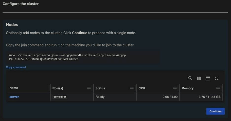 - Màn hình tiếp theo hiển thị các thông tin để kết nối các nút khác vào cụm, nhưng đối với triển khai đơn giản này, bạn triển khai với cụm một nút bằng cách chọn Continue, như được minh họa trong ảnh chụp màn hình sau.