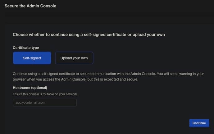 - Để tải lên chứng chỉ của riêng bạn nhằm bảo mật bảng điều khiển quản trị, chọn Upload your own. Để sử dụng chứng chỉ tự ký mặc định, chọn Self-signed, như được minh họa trong ảnh chụp màn hình sau.