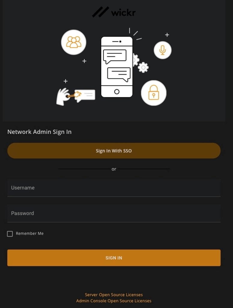 Hiện tại bạn đã có một máy chủ Wickr Enterprise đang hoạt động. Bạn có thể truy cập vào bảng điều khiển quản trị của Wickr Enterprise bằng cách điều hướng đến https://hostname, và bạn sẽ thấy trang đăng nhập dành cho truy cập quản trị của Wickr Enterprise, như được minh họa trong ảnh chụp màn hình sau.