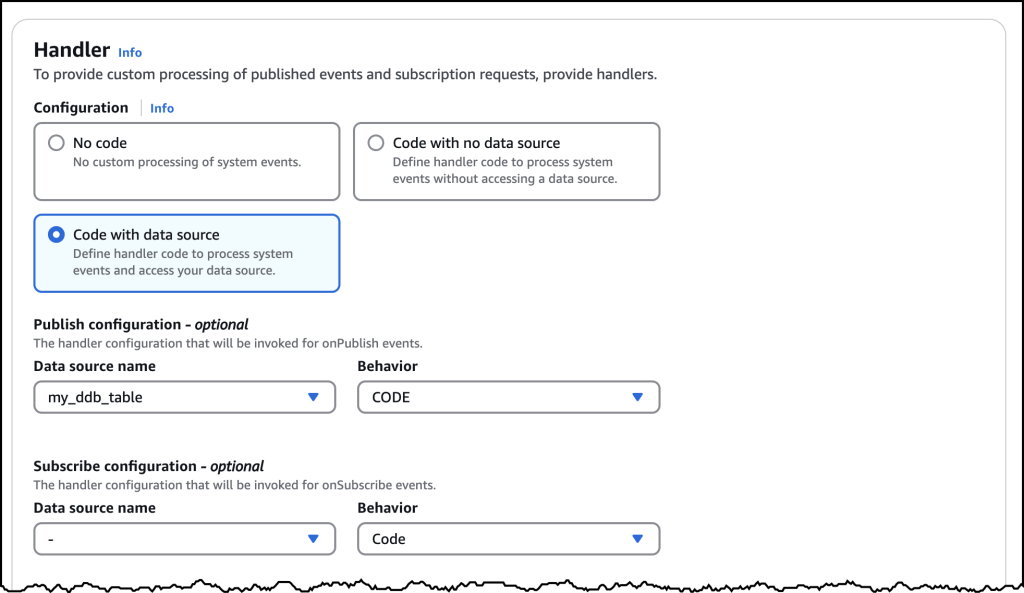 Bấm Create event handlers mở ra một hộp thoại mới, tôi chọn Code with data source và chọn nguồn dữ liệu DynamoDB làm cấu hình cho publish.