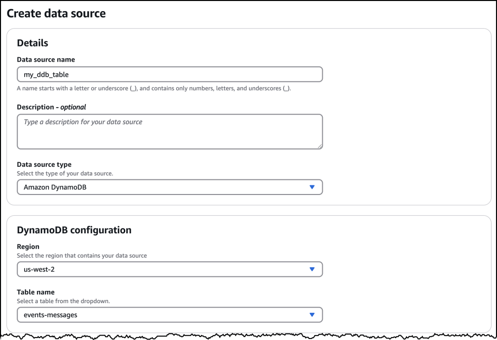 Tôi đặt tên cho nguồn dữ liệu, rồi chọn Amazon DynamoDB từ menu Data source. Cấu hình cho DynamoDB sẽ hiện ra.