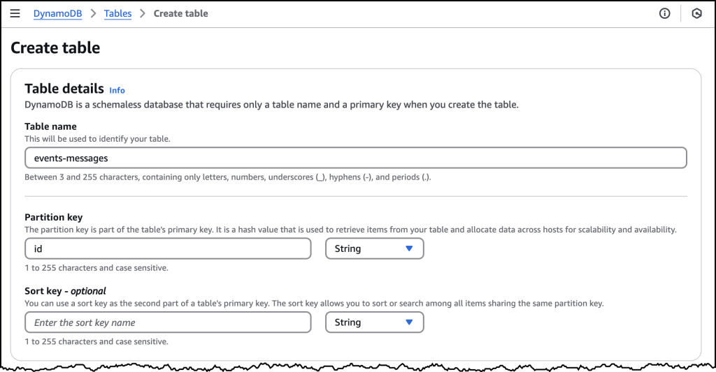 Có nhiều loại tích hợp nguồn dữ liệu để chọn. Trong ví dụ đầu tiên này, tôi sẽ tạo một bảng DynamoDB làm nguồn dữ liệu. Tôi truy cập DynamoDB trong console và tạo bảng mới tên là event-messages. Bảng chỉ cần một Partition Key là id . Sau đó tôi bấm Create table và chấp nhận cấu hình mặc định rồi quay lại AppSync.