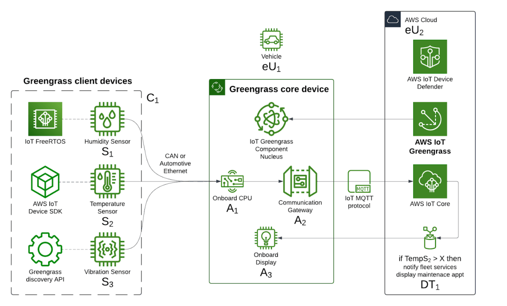 Chúng tôi sử dụng ví dụ về một chiếc xe thông minh hiện đại (ô tô) để minh họa mô hình này, sử dụng cách ký hiệu được NIST khuyến nghị để minh họa tất cả các thành phần cơ bản: các sensor (Sn) được nhóm thành một cụm (C1), sử dụng các kênh giao tiếp được biểu thị bằng các mũi tên liền nét để gửi dữ liệu đến các aggregator (An), được đặt trên hoặc truyền đến các tiện ích bên ngoài (eUn). Chúng tôi đã hình dung một kịch bản quản lý đội xe trong đó cảm biến nhiệt độ đang gửi dữ liệu đến máy tính trên xe, máy tính này sẽ tổng hợp và chắt lọc dữ liệu để chỉ giữ lại những thông tin liên quan (relevant), sau đó truyền lên đám mây. Điều này cho phép dịch vụ đám mây (AWS IoT Core) có trình kích hoạt quyết định (DTn), trong ví dụ này đang thể hiện việc thực hiện hai hành động sau khi phát hiện nhiệt độ cao: (1) thông báo cho các dịch vụ đội xe (2) hiển thị tùy chọn cuộc hẹn bảo dưỡng trên màn hình trên xe hoặc trong cabin.