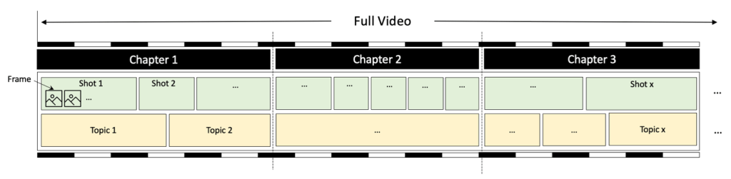 - Chapter – Một chuỗi shot tạo thành một đơn vị hành động hoặc tường thuật mạch lạc trong video, hoặc một chủ đề cuộc trò chuyện liên tục. BDA xác định ranh giới chương bằng cách đầu tiên phân loại video có nội dung chủ yếu là hình ảnh (như phim hoặc nội dung theo tập) hoặc nội dung chủ yếu là âm thanh (như tin tức hoặc thuyết trình). Dựa trên phân loại này, sau đó nó quyết định có nên thiết lập ranh giới sử dụng chuỗi shot dựa trên hình ảnh hay chủ đề cuộc trò chuyện dựa trên âm thanh.