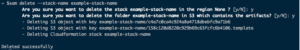 Bạn có thể sử dụng SAM CLI để xóa các tài nguyên đã triển khai và đảm bảo rằng bạn không tiếp tục phải chịu phí. Để xóa các tài nguyên, hãy chạy lệnh sau từ shell của bạn và thay thế <stack-name> bằng tên stack mà bạn đã cung cấp cho SAM khi chạy sam deploy. Làm theo lời nhắc để xác nhận việc xóa tài nguyên.
