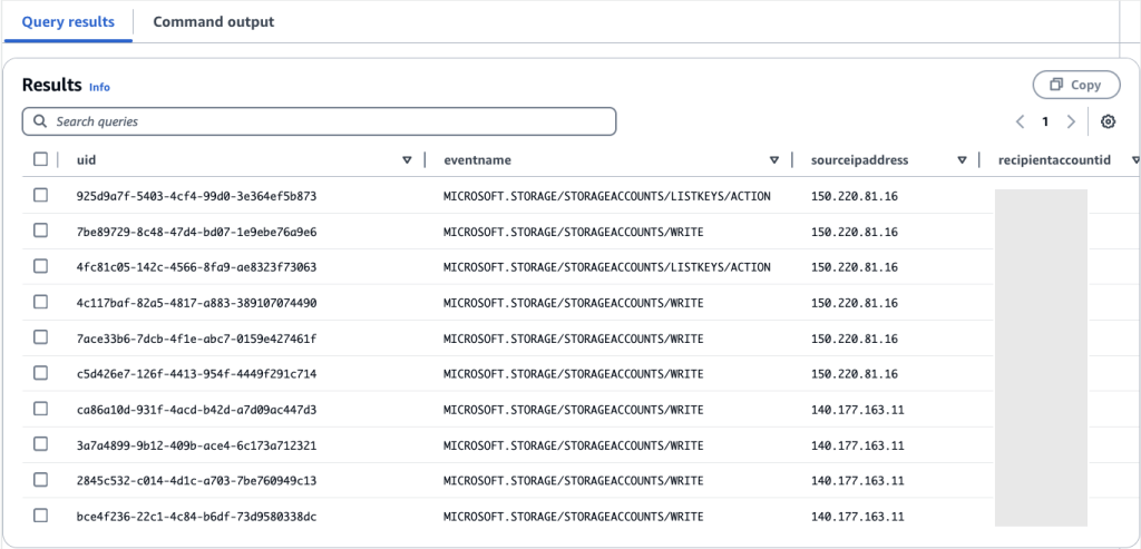 1. Liệt kê tất cả các tài khoản lưu trữ trong môi trường Azure bằng truy vấn bên dưới và thay thế <EventDataStoreID> dành riêng cho Tài khoản AWS của bạn