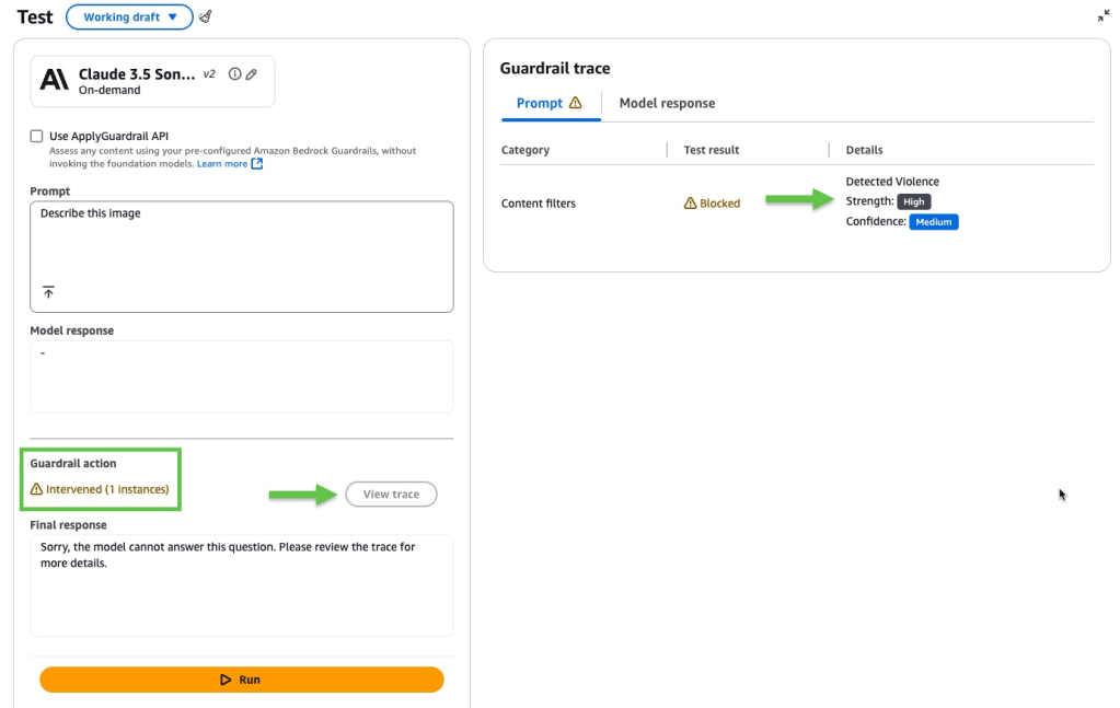 Bản ghi theo dõi (trace) của guardrail cung cấp thông tin về cách các biện pháp an toàn đã được áp dụng trong một phiên tương tác. Nó cho thấy liệu Amazon Bedrock Guardrails có can thiệp hay không, và những đánh giá nào đã được thực hiện trên cả yêu cầu đầu vào (prompt) và phản hồi của mô hình (model response). Trong ví dụ này, các bộ lọc nội dung đã chặn yêu cầu đầu vào bởi vì chúng phát hiện thấy yếu tố bạo lực trong hình ảnh với độ tin cậy (confidence) ở mức trung bình.