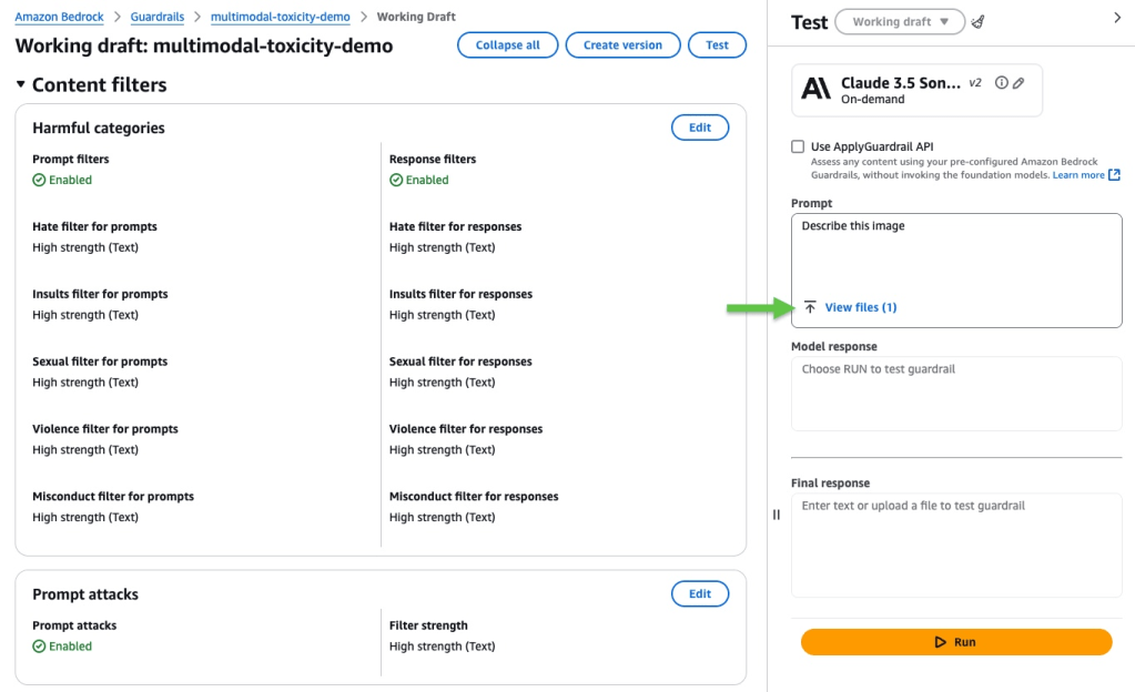 Hãy chọn một mô hình hỗ trợ đầu vào hoặc đầu ra dạng hình ảnh, ví dụ như Claude 3.5 Sonnet của Anthropic. Xác minh rằng các bộ lọc yêu cầu đầu vào (prompt) và phản hồi (response) đã được bật cho nội dung hình ảnh. Sau đó, hãy cung cấp một yêu cầu đầu vào (prompt), tải lên một tệp hình ảnh, và nhấn Run.