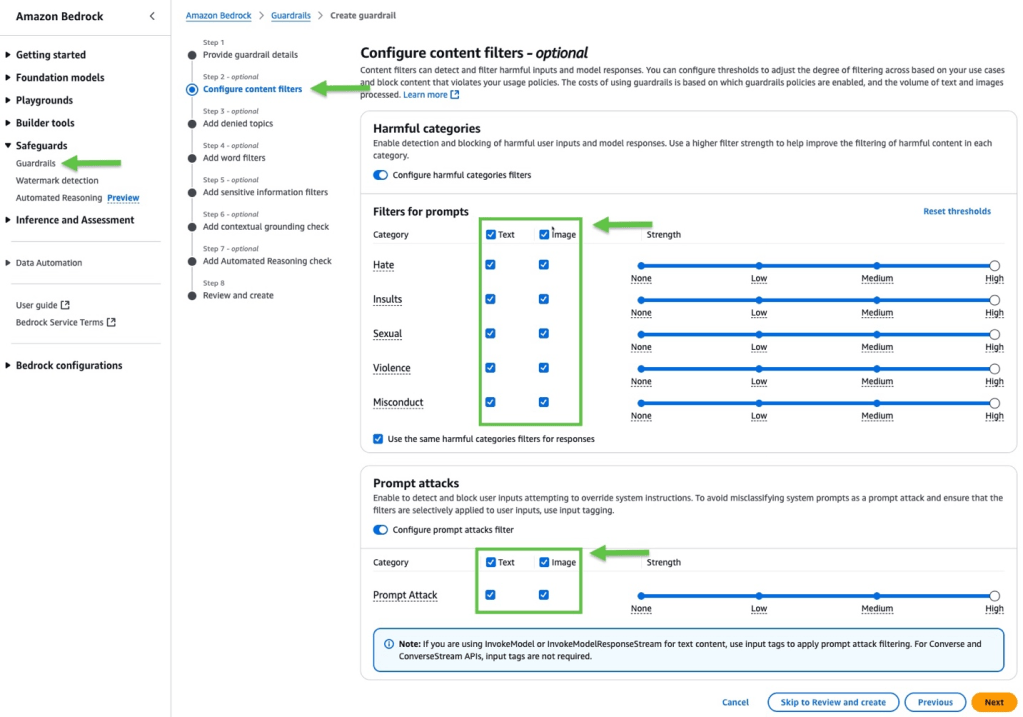 - Trong phần Configure content filters, bên dưới các mục Harmful categories và Prompt attacks, bạn có thể sử dụng các bộ lọc nội dung hiện có để phát hiện và chặn dữ liệu hình ảnh ngoài dữ liệu văn bản.