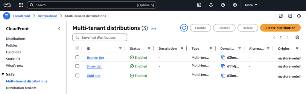 Hãy cùng tìm hiểu cách MyStore cấu hình các trang web của khách hàng theo nhiều cấp với CloudFront SaaS Manager. Để bắt đầu, bạn có thể tạo một multi-tenant distribution đóng vai trò như một mẫu tương ứng với ba cấp giá mà MyStore cung cấp: Đồng, Bạc và Vàng, được hiển thị trong phần Multi-tenant distribution dưới menu SaaS trên bảng điều khiển Amazon CloudFront.
