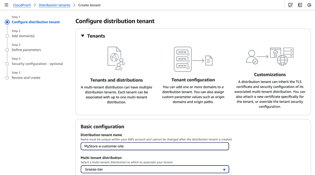 Mỗi tenant có thể được liên kết với tối đa một multi-tenant distribution. Bạn có thể thêm một hoặc nhiều tên miền của khách hàng vào một distribution tenant và gán các giá trị tham số tùy chỉnh, chẳng hạn như tên miền nguồn (origin domains) và đường dẫn nguồn (origin paths). Một distribution tenant có thể kế thừa chứng chỉ TLS và cấu hình bảo mật của multi-tenant distribution được liên kết với nó. Bạn cũng có thể gắn một chứng chỉ mới dành riêng cho tenant hoặc ghi đè cấu hình bảo mật của tenant.