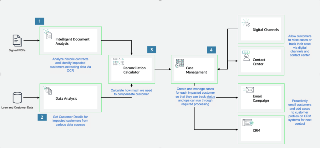 Lớp xử lý tài liệu kết hợp khả năng xử lý tài liệu thông minh (Intelligent Document Processing) mạnh mẽ dựa trên GenAI của Amazon Bedrock với các mô hình nền tảng (foundation models) của dịch vụ này để phân tích hợp đồng tài chính và xác định khách hàng bị ảnh hưởng bởi DCA. Quá trình tự động này xử lý hàng ngàn tài liệu trong vài giờ thay vì vài tuần, kể cả khi định dạng tài liệu thay đổi theo thời gian. Các tài liệu có thể được sao chép vào Amazon S3 bằng cách sử dụng các dịch vụ chuyển dữ liệu như AWS DataSync hoặc AWS Transfer Family. - Lớp Data Ingestion & Preparation
