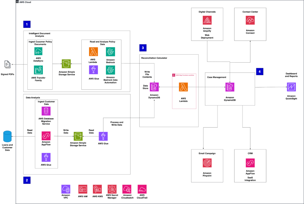Danh mục: Amazon AppFlow, Amazon Bedrock, Amazon CloudWatch, Amazon Connect, Amazon DynamoDB, Amazon Pinpoint, Amazon QuickSight, Amazon VPC, AWS CloudTrail, AWS Database Migration Service, AWS Glue, AWS Identity and Access Management (IAM), AWS Key Management Service, AWS Lambda, AWS Step Functions, Financial Services, Generative AI, Industries