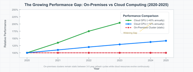 Ngân sách eo hẹp buộc phải cân nhắc giữa việc phục vụ các nhà nghiên cứu hiện tại và việc theo kịp sự phát triển nhanh chóng của phần cứng. Khi phần cứng chuyên dụng cho nhu cầu cao điểm phải được cân nhắc trong nhiều năm, các tổ chức chắc chắn sẽ không đầu tư đủ vào các nguồn lực mà các nhà nghiên cứu cần nhất. Trong khi đó, bạn chứng kiến đà nghiên cứu chậm lại khi những khám phá đột phá phải chờ đợi tài nguyên tính toán. Khoảng cách hiệu suất ngày càng lớn. Trong khi các hệ thống tại chỗ vẫn giữ nguyên giữa các chu kỳ làm mới lớn cứ sau 3-5 năm, cơ sở hạ tầng đám mây liên tục phát triển với những cải tiến phần cứng mới nhất, như minh họa trong hình dưới đây.