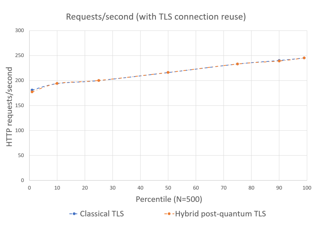 Hình 1 cho thấy số lượng yêu cầu mỗi giây được thực hiện ở các phân vị khác nhau khi tái sử dụng kết nối TLS 1.3 bị tắt. Trong kịch bản xấu nhất — khi chi phí của mỗi lần bắt tay TLS không được phân bổ và mọi yêu cầu HTTP đều phải thực hiện đầy đủ quá trình bắt tay TLS — việc bật TLS lai post-quantum làm giảm số giao dịch mỗi giây (TPS) trung bình khoảng 2,3%, từ 108,7 TPS xuống còn 106,2 TPS.
