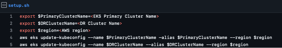 - Đặt các biến môi trường (như được hiển thị trong hình 1) với tên cụm EKS Chính và DR: