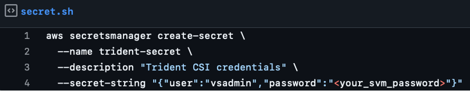 - Sử dụng lệnh sau (như được hiển thị trong hình 2) để tạo các bí mật (secrets) khác nhau bằng AWS Secrets Manager cho mỗi FSx for ONTAP SVM: