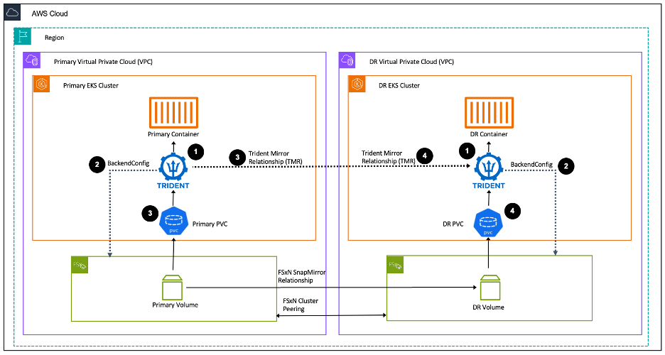 Bài viết này chỉ cho bạn cách triển khai Trident bằng tiện ích bổ sung (add-on) từ AWS Marketplace, thiết lập sao chép dữ liệu giữa hai cụm Amazon EKS với hai hệ thống tệp FSx for ONTAP và kiểm tra chuyển đổi dự phòng.