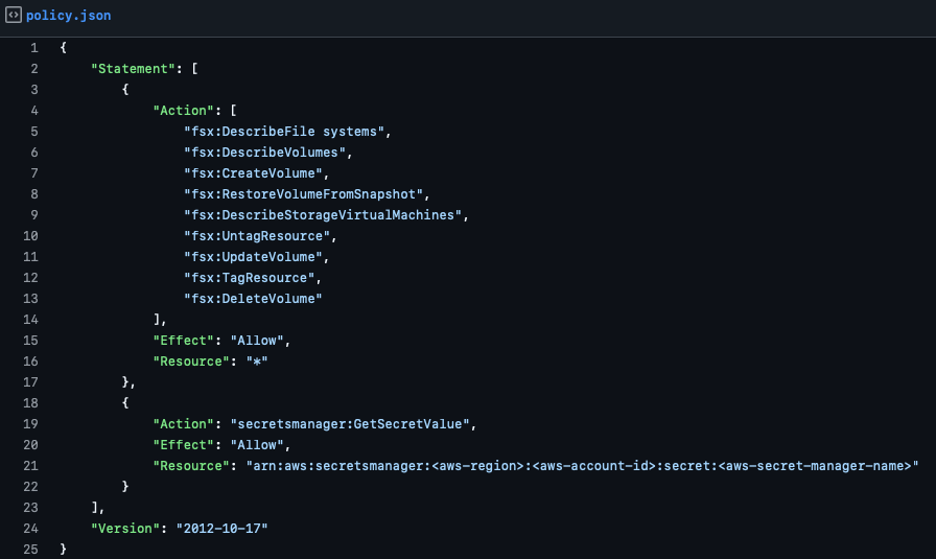 Hình 4: policy.json chứa các quyền AWS IAM cho các hoạt động FSx và quyền truy cập Secrets Manager