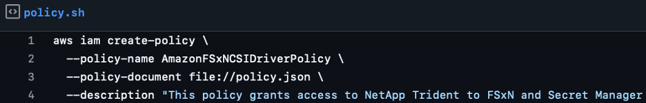 Hình 5: Lệnh AWS CLI tạo chính sách AWS IAM cho tích hợp trình điều khiển Trident CSI